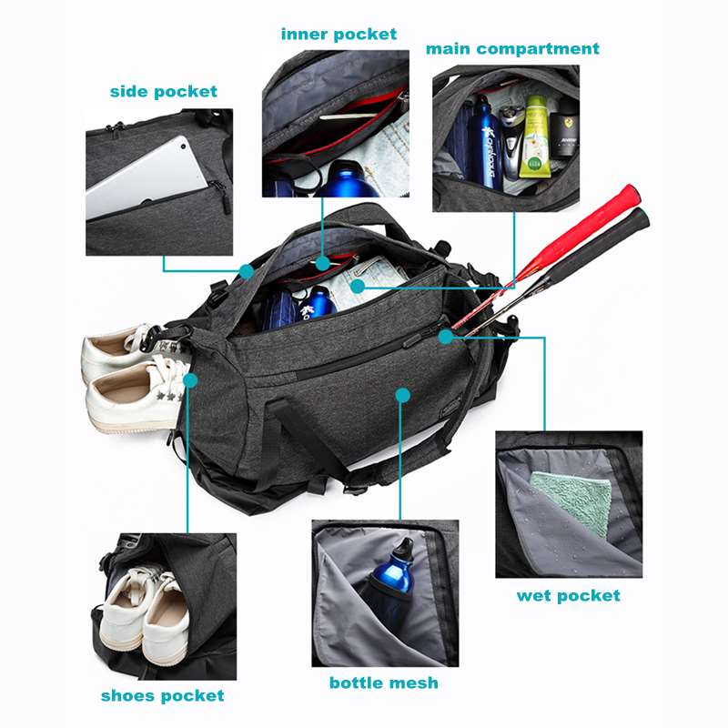 This duffel bag affords durability, while the roomy main compartment stands tall for easy packing and storage space. The side pockets to keep shoes and wet pocket to seperate sweaty tops and wet towel. You can bring everything you need along with it. There are 3 ways to carry: handheld, on a single shoulder and backpack.